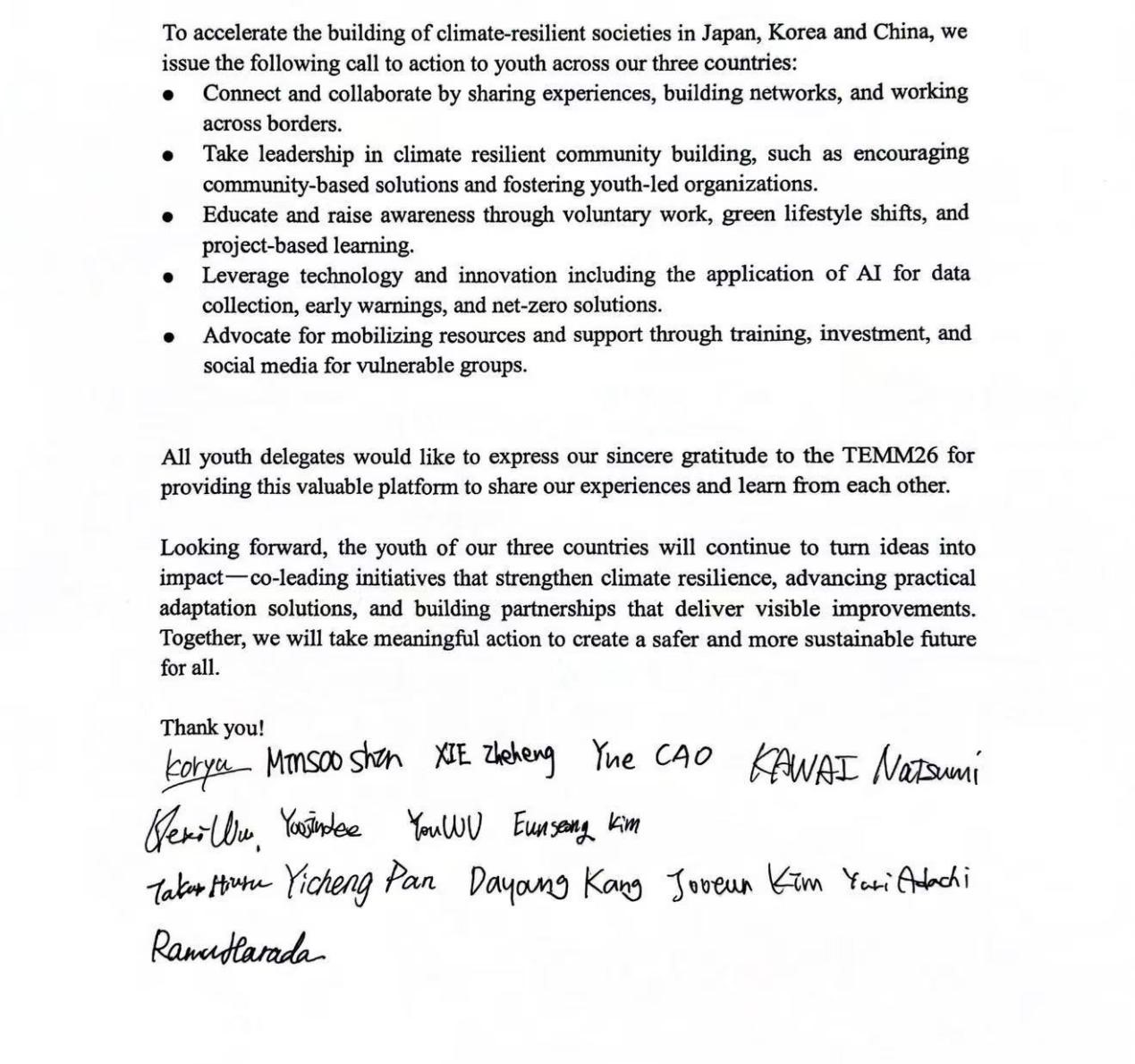 作为第二十六次中日韩环境部长会议青年论坛(TEMM26 Youth Forum)重要成果之一,倡议提出跨国联动、社区引领、教育赋能、科技创新、资源动员五大行动方向,呼吁建立长期合作平台,推动基层气候适应行动,完善净零转型方案,并加大对弱势群体的资金与培训支持。